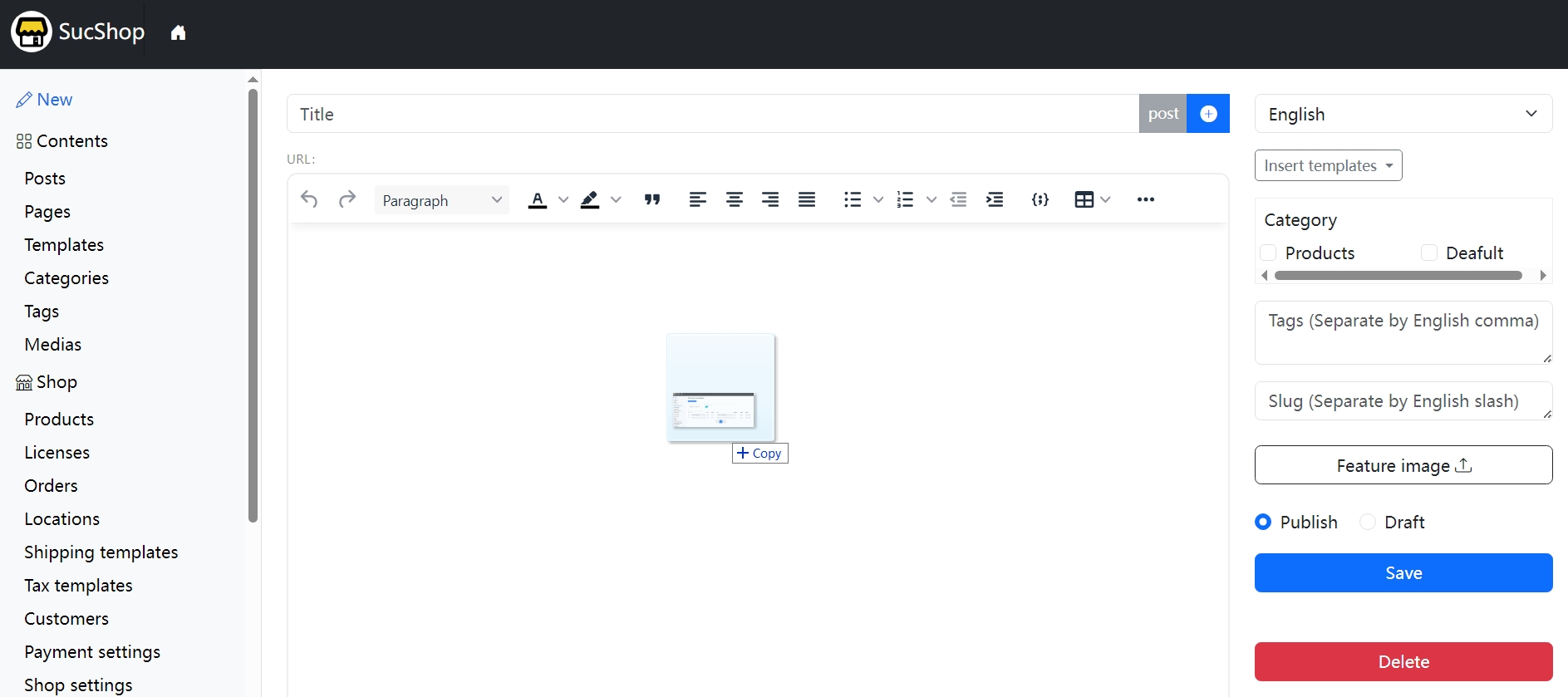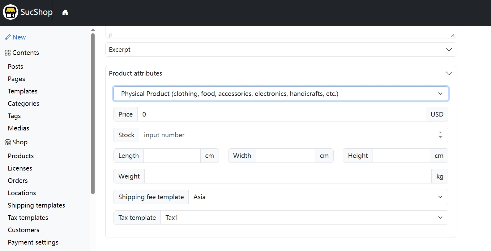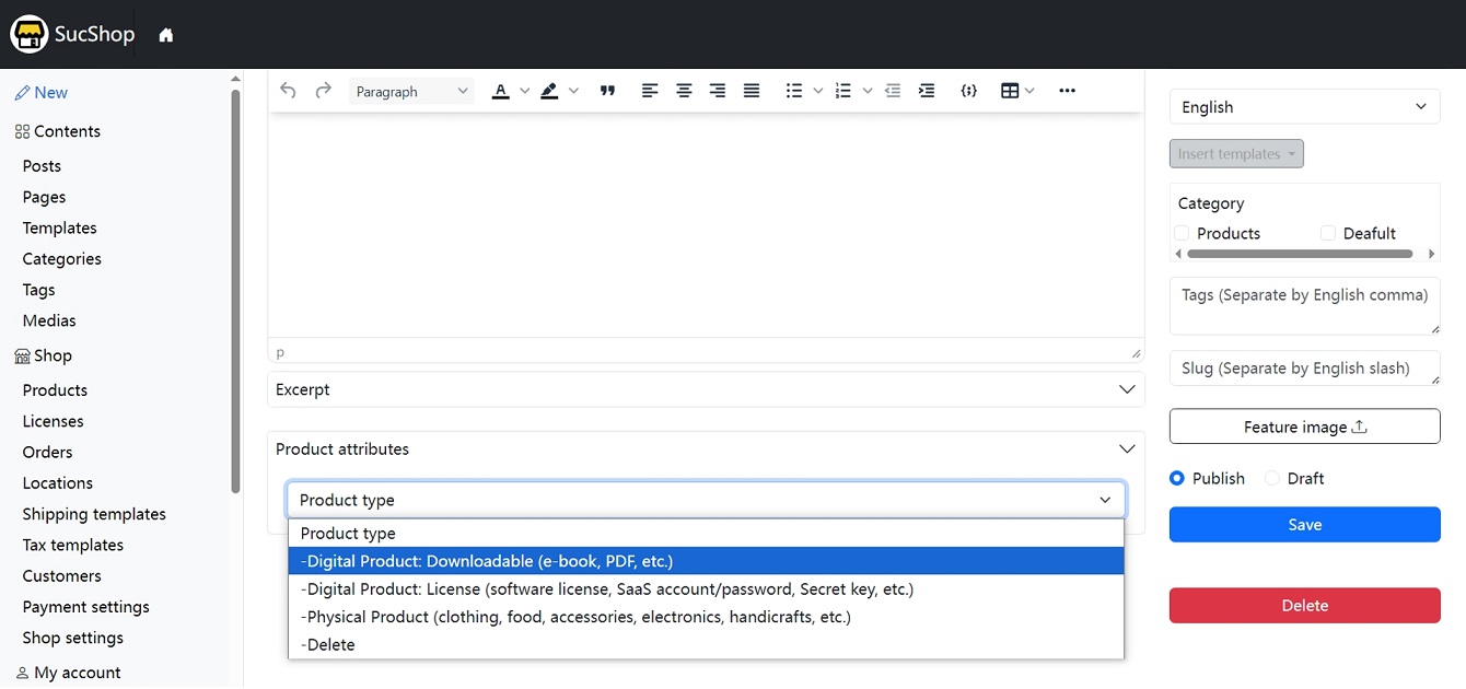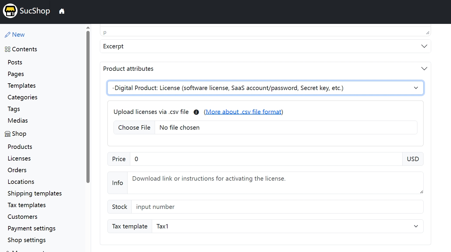 In SucShop, publishing posts and products is integrated. If you want to publish a product, simply create a post first, then add product details in the Product Attributes panel. If you sell license keys, you can upload your license key file in the same Product Attributes section.