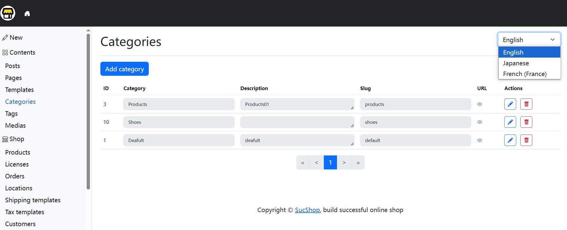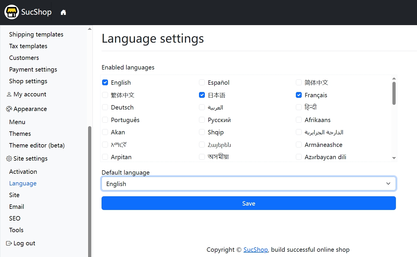 After installing SucShop, the first thing you should do is configure your website’s languages. SucShop supports adding one or more languages and allows you to set one language as the default. SucShop’s language list includes most major global languages by default. If the language you need is not in the list, or if you want to modify a language’s name/code, you can refer to this tutorial to add or edit it.