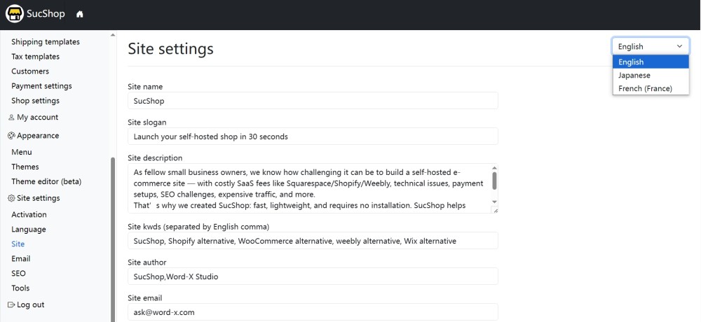 Since SucShop natively supports multiple languages, you can set a full set of site information for each language. This means your website can display different titles and slogans in different languages. The HTML meta tags will also switch according to the display language of the website.