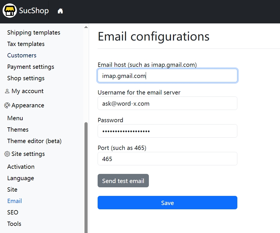 SucShop can send emails without requiring any additional plugins. All you need to do is configure your email server information in the Email Settings page. You can use free email services such as Gmail or Outlook to send emails. In many ways, SucShop helps small business owners significantly reduce operating costs.