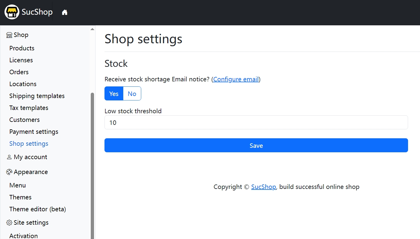 In Shop → Shop Settings, you can configure essential settings for your online store, such as low-stock alerts and threshold values. We will continue adding more shop-related settings in this page based on user needs.