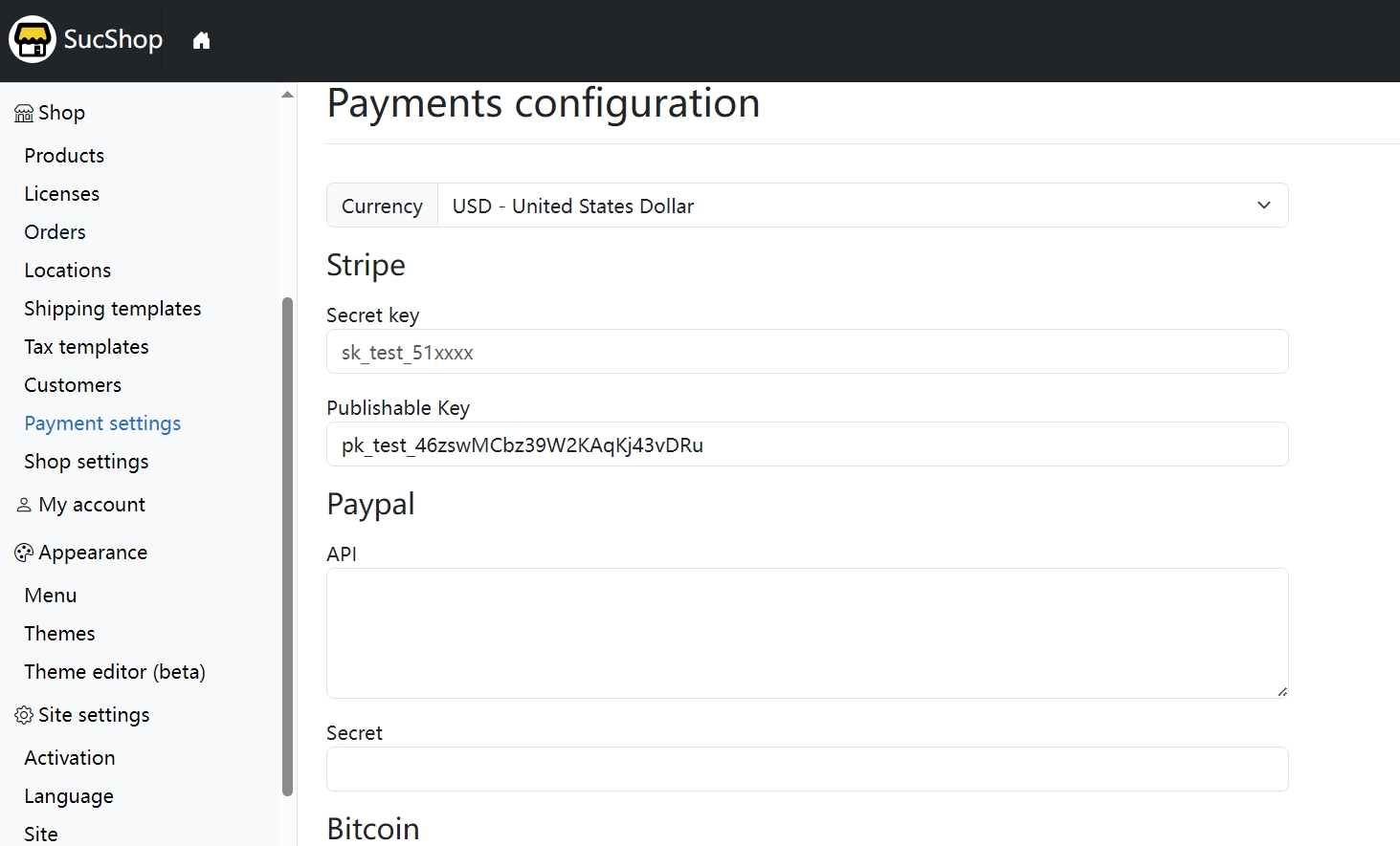 To operate an online store, the most important part is receiving payments. SucShop currently supports Stripe, PayPal (pending), Bitcoin Wallet (pending), and more. You can configure payment APIs in Shop → Payments.