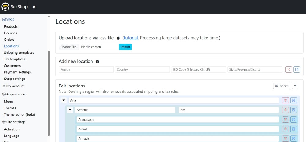 More importantly, SucShop supports high-level customization. You can prepare a CSV file containing countries, regions, and cities that your store can deliver to, and upload it to the Locations page. Whether you want to support delivery to single/multiple cities, states, countries, or continents, you can achieve it by uploading a custom Locations table.