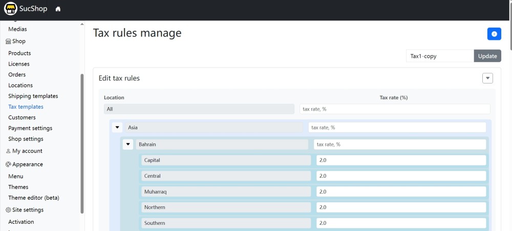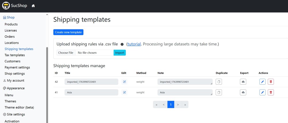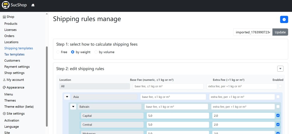 After configuring the locations table, you can create shipping templates based on it. SucShop supports bulk editing of shipping rules by city, country, or region.
