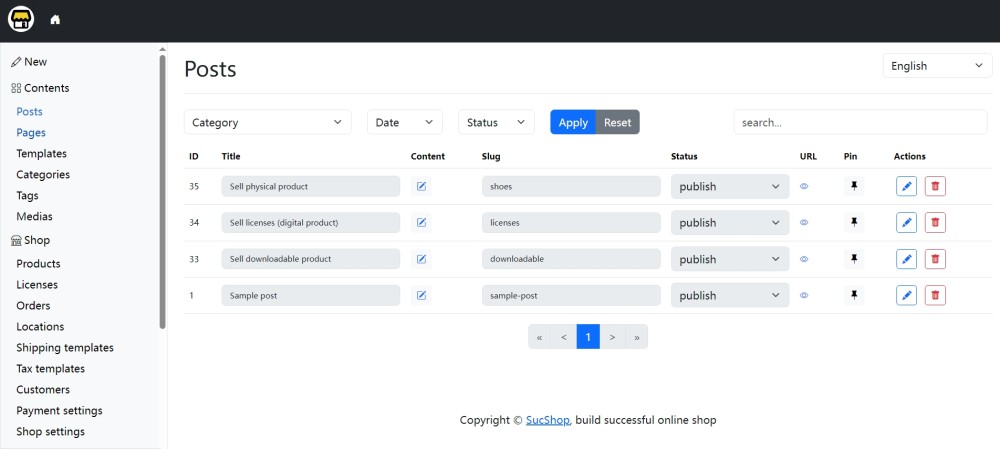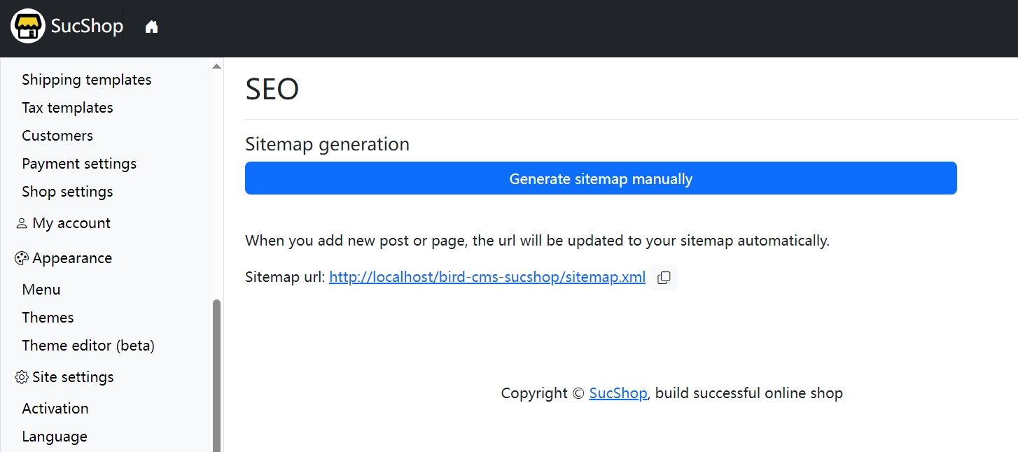 You can generate a sitemap manually in the SEO page. Additionally, SucShop automatically adds new post URLs to the sitemap whenever you create or update posts. With many other online store builders, you may need multiple plugins to achieve this.