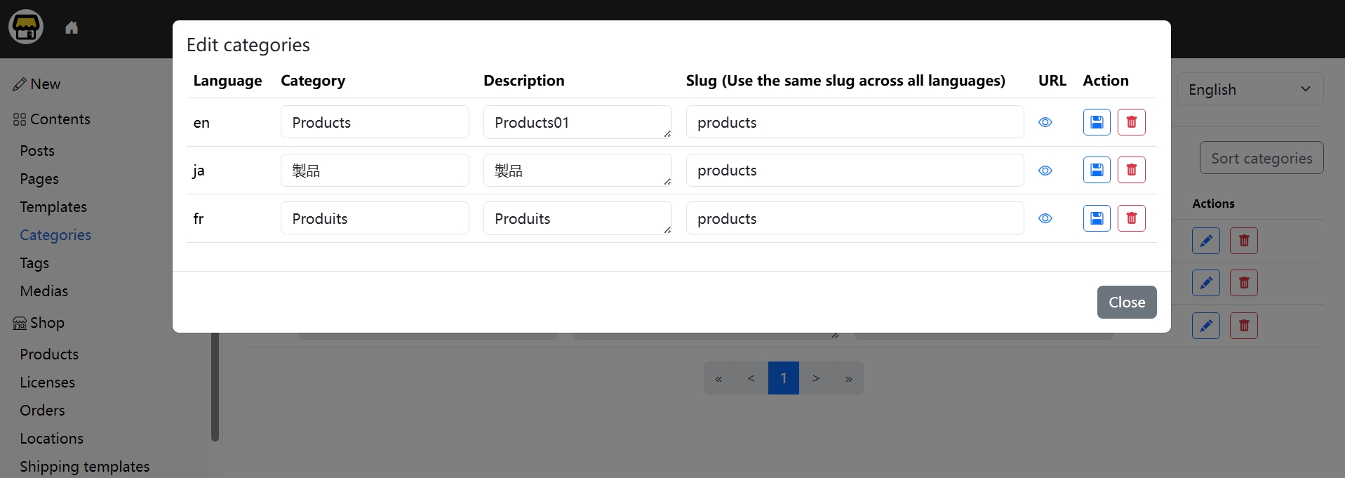 On the categories management page, you can rearrange categories by drag-and-drop. You can also edit translations for a category in multiple languages.