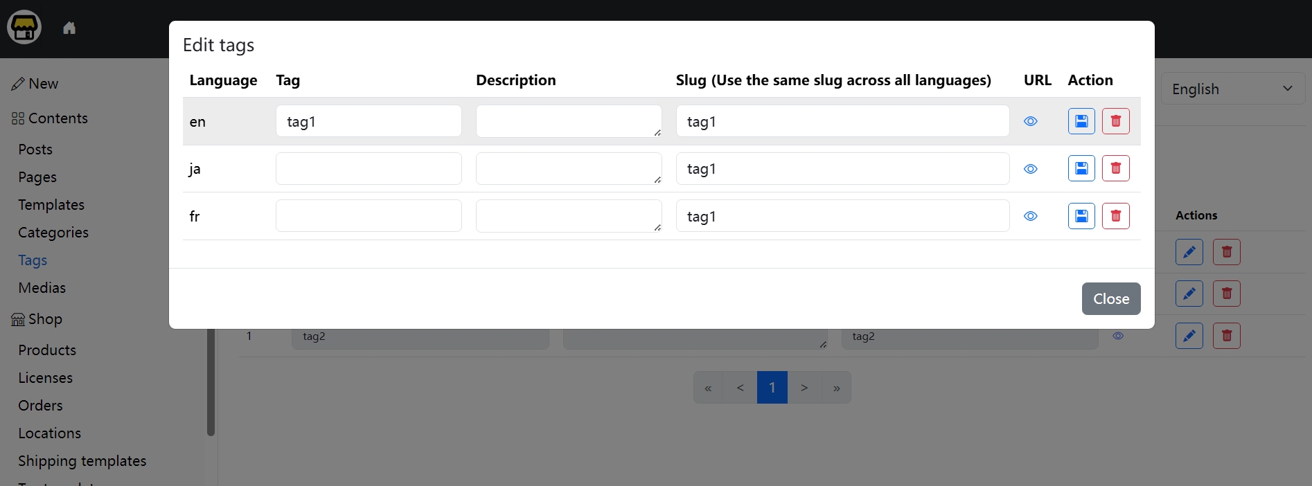 Similarly, on the tags management page, you can edit the translations of a tag across multiple languages.