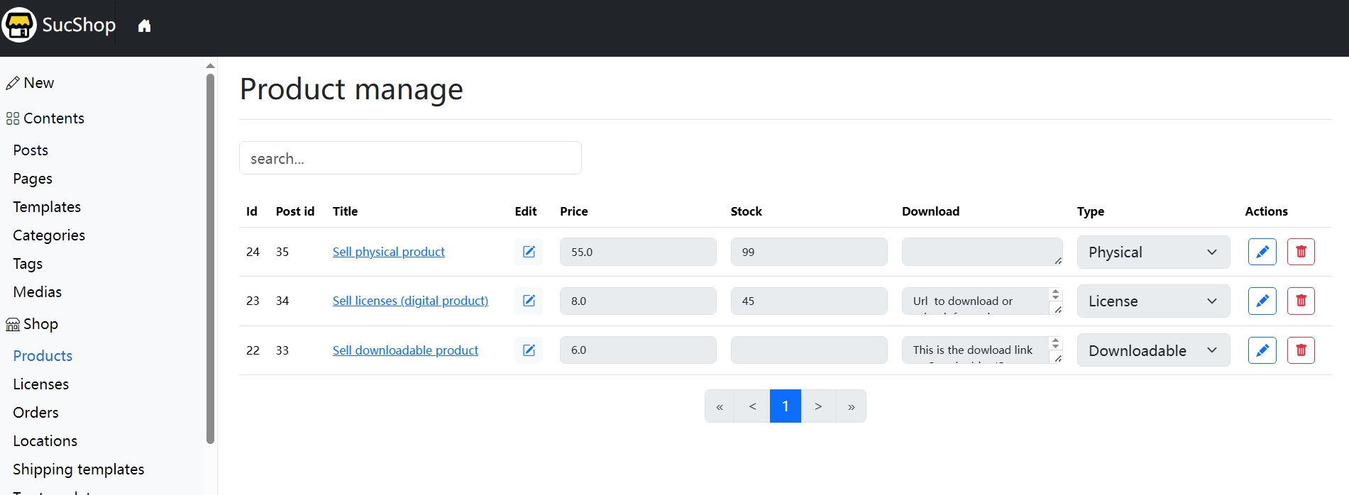 In the product management page, you can edit product prices, stock quantities, download information, product type, etc. You can also delete products.