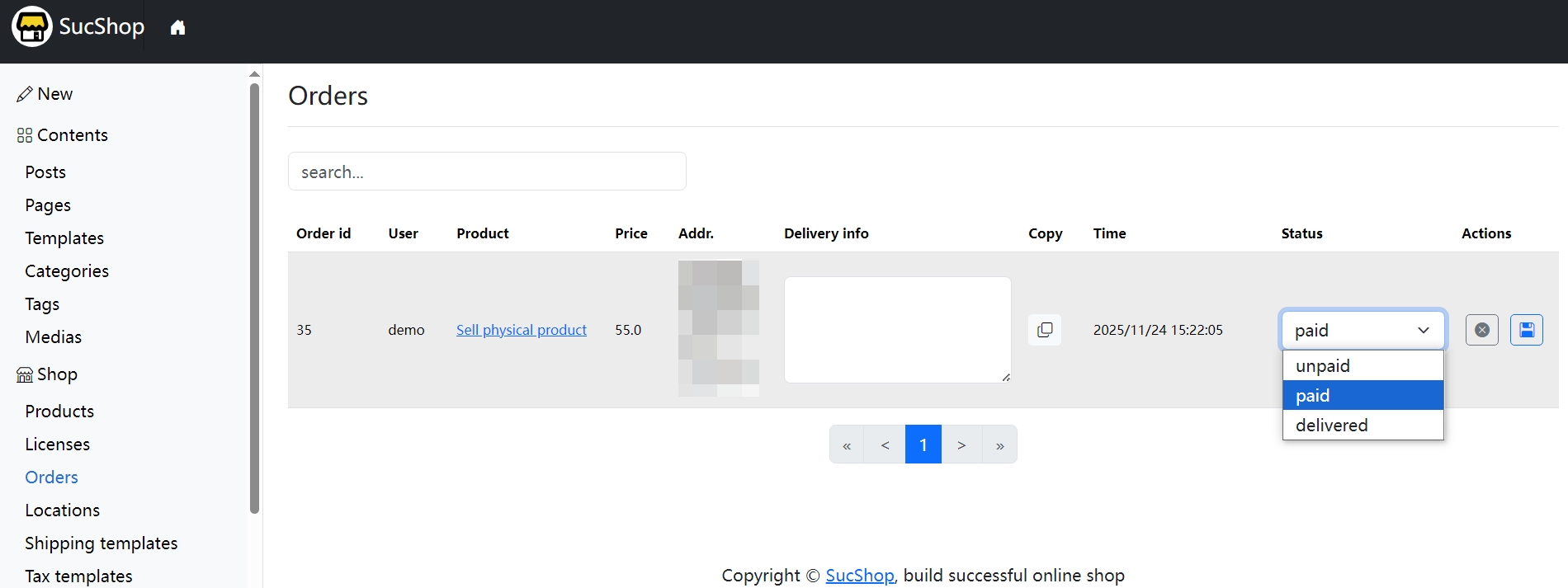 In the order management page, you can view sales data, update a shipment’s delivery status, and edit logistics information. Once you set an order’s status to Delivered, SucShop will automatically notify the user via email.