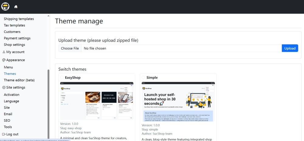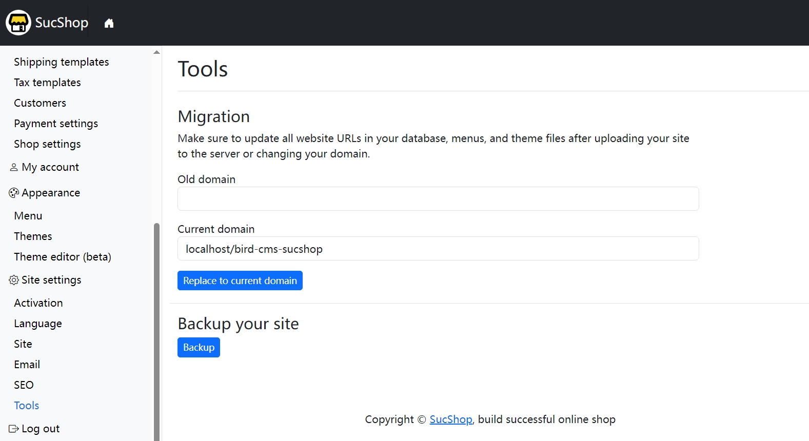 Considering common needs such as migrating a local (localhost) site to a remote server or changing your store’s domain, SucShop provides a Migration feature that allows you to replace the old domain with a new one.