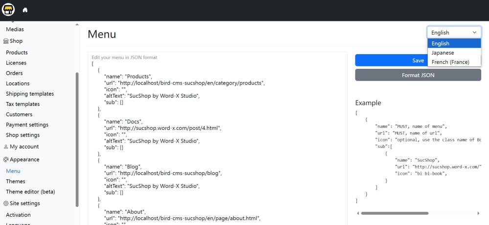 We once experimented with various graphical menu editors, but in the end, we decided to stick with JSON. It’s more straightforward and remains reliable over time. You might think that using JSON-formatted menu data is outdated, but in fact, it’s highly efficient. JSON involves no technical barriers—anyone can edit the menu simply by copying and pasting the data, and it offers far greater flexibility.