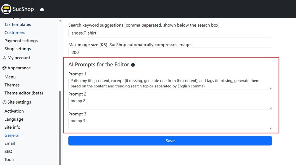 Go to Admin Dashboard → General → AI Prompts for the Editor, and configure your custom prompts. You can create up to three prompt sets. Since a single prompt can include multiple instructions and constraints, three sets are more than sufficient for most use cases.