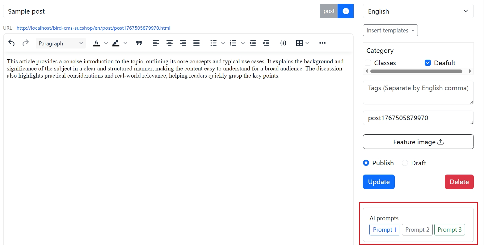 On the Editor page, write your title, main content, summary, and other details. Then click one of the prompt buttons in the AI prompts card. SucShop will automatically extract the title, content, summary, and tags from the page, generate the corresponding prompt, and copy it to your clipboard.