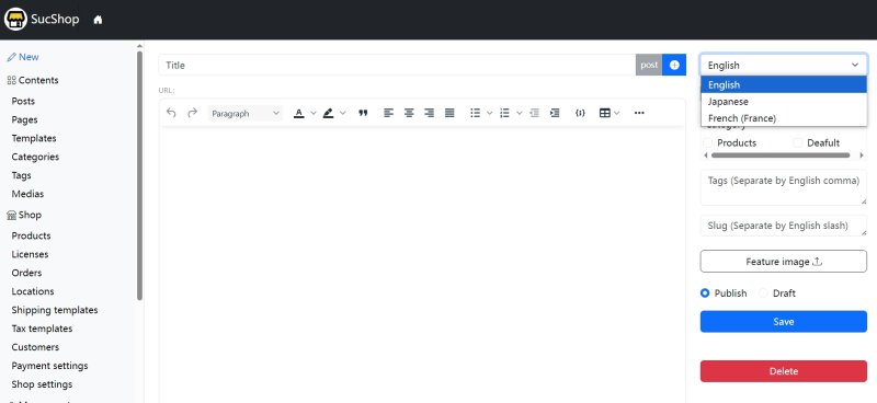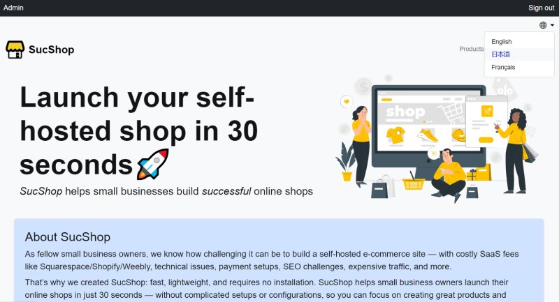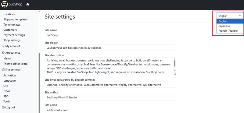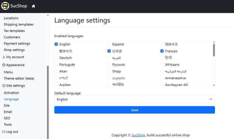 SucShop provides native multi-language support. Go to Site Settings → Language to choose your supported languages and set the default language.