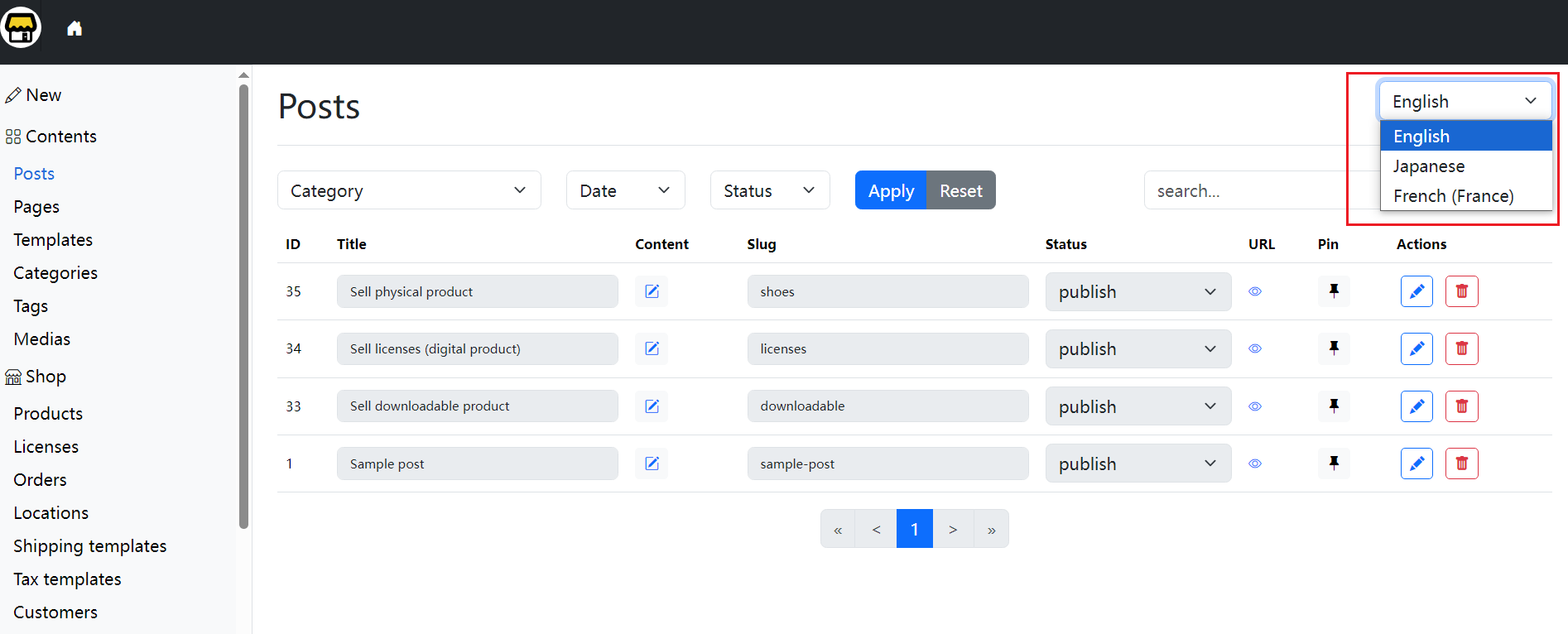 You can manage posts by switching languages using the menu in the top-right corner.