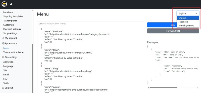 Each language also has its own menu. Configure the menu for each language under Appearance → Menu.