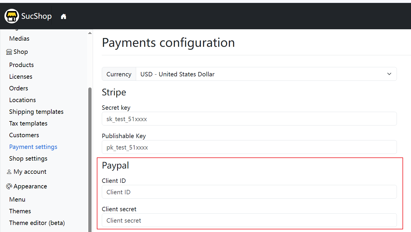 Although Stripe has become very popular, PayPal, as a long-established payment giant, still holds a very large market share and a vast number of users. Therefore, SucShop 1.1.2 has integrated PayPal payments. You only need to enter your PayPal Client ID and Client Secret on the backend Shop → Payments page (obtain your PayPal Client ID and Client Secret), and you will be able to receive payments through PayPal.